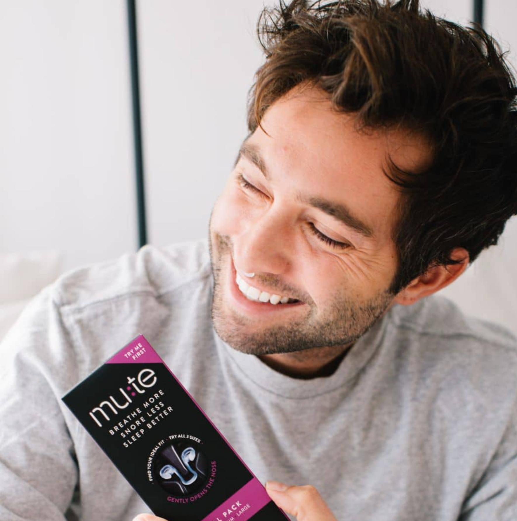 Mute is a nasal breathing device designed to increase airflow through your nose during sleep by gently opening your airways.